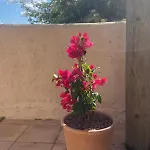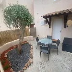 Along with self-catering amenities like an equipped kitchenette, the apartment also offers an outdoor dining area. Guests can take a dip in an outdoor swimming pool to relax after a long day.
